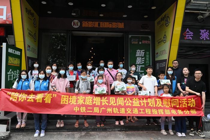 中铁二局广州指挥部电务分部自2021年以来,每年与驻地所在社区、街道签署党建共建协议,积极投身社会公益事业,彰显央企大爱情怀。为进一步扩大公益活动覆盖面,多方面参与社会公益,项目部与东沙街道社工服务中心联合开展“陪你去看看”困境家庭增长见闻计划。经过周密筹措和调动各方资源,双方合理划分职责,社工服务中心与影院商榷活动场地和预算等事宜,项目部青年志愿者积极做好后勤保障工作,为因病、残而丧失劳动力的困境家庭带去一场温馨的陪伴观影活动,并给30个困境家庭送上慰问品,活动参与人数共计68人。