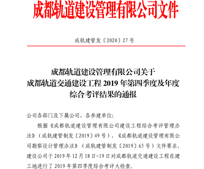 近日,成都轨道建设管理有限公司行文公布2019年第四季度及年度综合考评结果,电务公司成都8号线机电1标项目部在8号线机电承包商年度排名中位列第一。