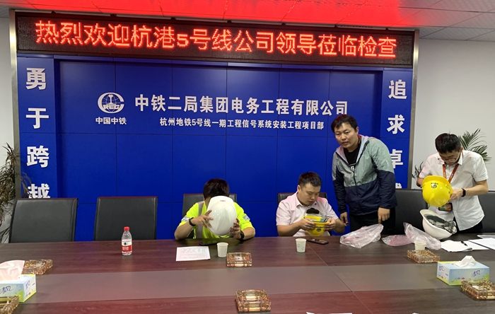 8月8日,杭州杭港地铁5号线公司安质组一行来到公司杭州地铁5号线一期工程信号系统安装工程项目经理部对安全帽的使用及管理情况进行了检查。