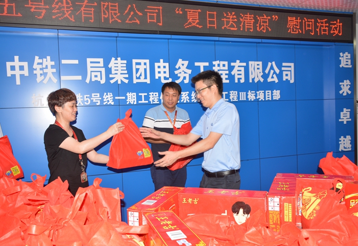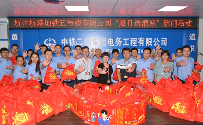 8月9日下午,杭州杭港地铁5号线有限公司向公司杭州地铁5号线供电、信号两个项目部送来“夏日清凉”慰问品,对员工进行了慰问。