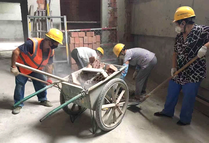 目前正是施工大干高峰期,整个车辆段的二次砌筑面积大,施工作业点较多,现场会产生很多建筑垃圾,保洁小组为了保证施工现场的卫生情况,每天错开与施工人员的作业时间,打扫清理现场,起早贪黑是常事。有时还会加班加点打整清理现场砌筑留下的建渣,撒漏的灰浆,风、水、电专业加工留下的废料等。保证施工现场的文明生产,防止现场留下安全隐患。
